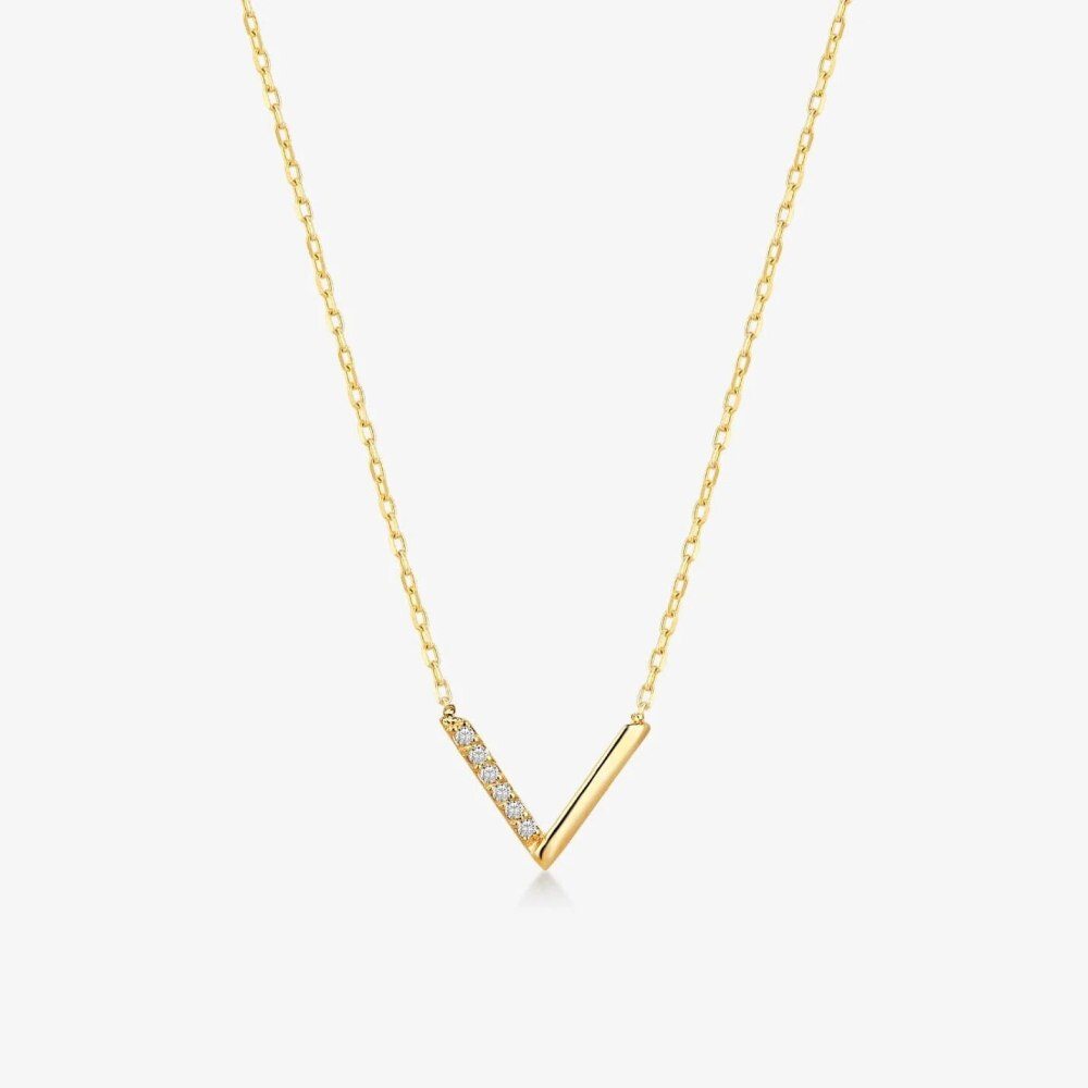 Meticulously crafted from solid 10K gold, this exquisite pendant necklace showcases a brilliant moissanite stone renowned for its exceptional fire and clarity. The chevron design symbolizes protection and strength, making it not merely an accessory but a personal talisman. Its versatile and feminine silhouette effortlessly elevates both everyday ensembles and special occasion attire, transitioning seamlessly from daytime sophistication to evening glamour. The necklace's durable 10K gold construction ensures lasting wear while maintaining a luxurious appearance. As a meaningful gift, it celebrates women who appreciate classic jewelry with modern luminosity, offering a perfect balance of enduring style and radiant sparkle that becomes a cherished part of any jewelry collection. Each piece reflects our commitment to quality craftsmanship and elegant design in fine jewelry.