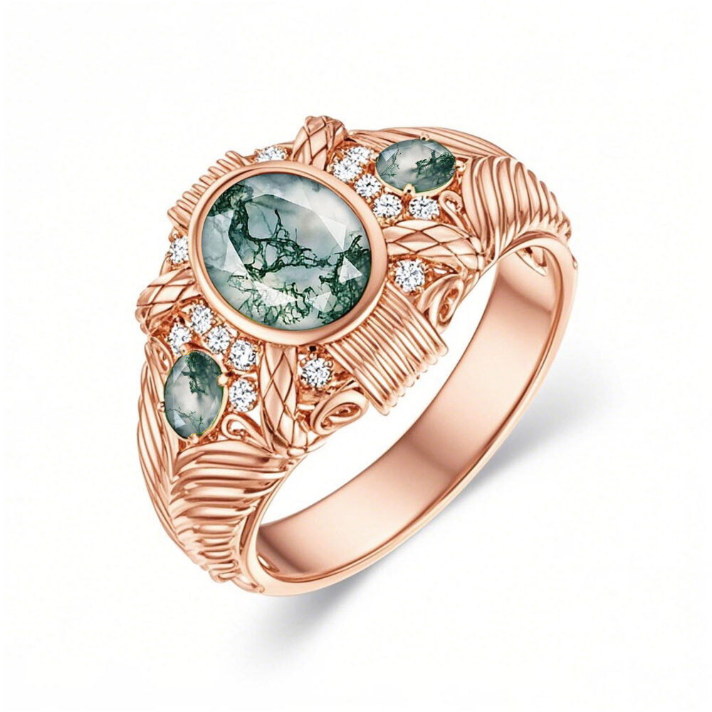 Discover the elegance of our stunning 10K Rose Gold ring, featuring a captivating round cut Moss Agate center stone weighing 2 CT, perfect for any woman who loves to express her individuality. Personalize this exquisite piece with custom engraving to create a unique treasure that reflects your style and personality, making it an ideal gift for yourself or a loved one.