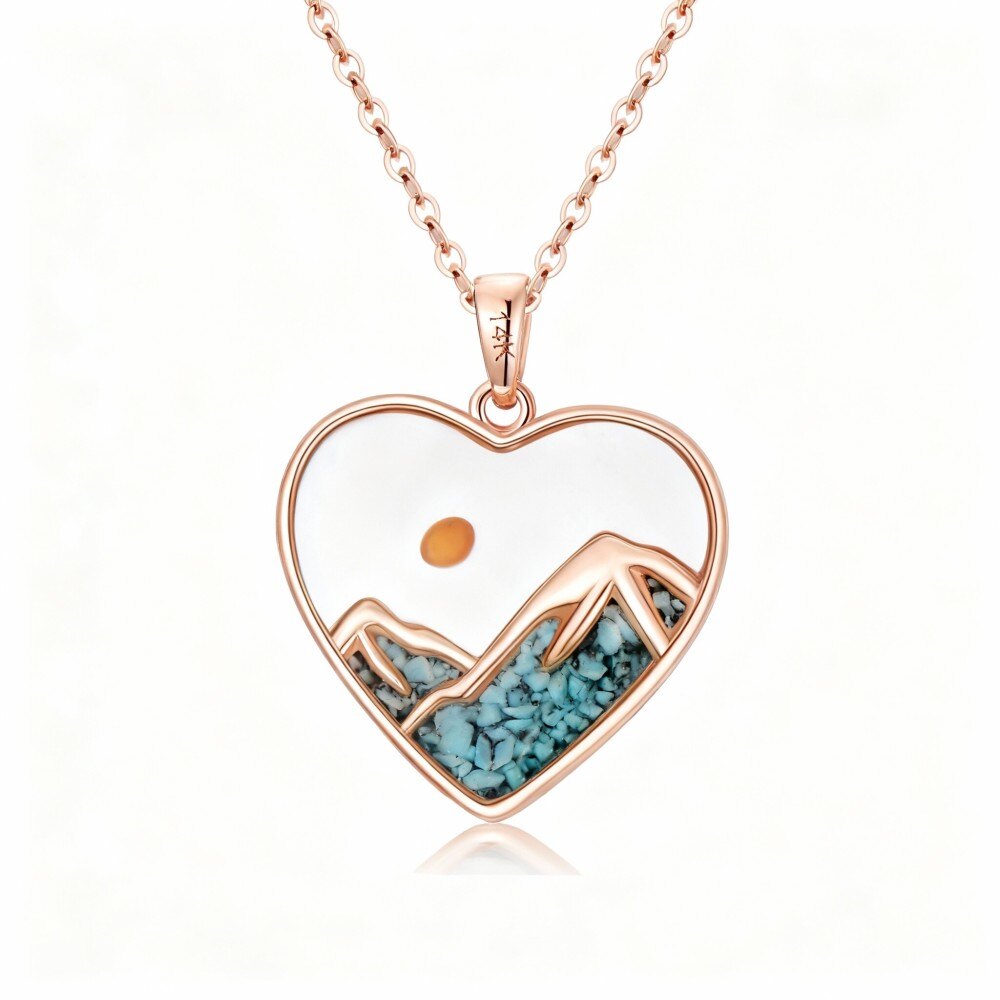 This stunning 10K Rose Gold necklace symbolizes hope and life, featuring mountains, a sun, and turquoise accents. Perfect for sensitive skin, it's durable and hypoallergenic, ideal for daily wear.