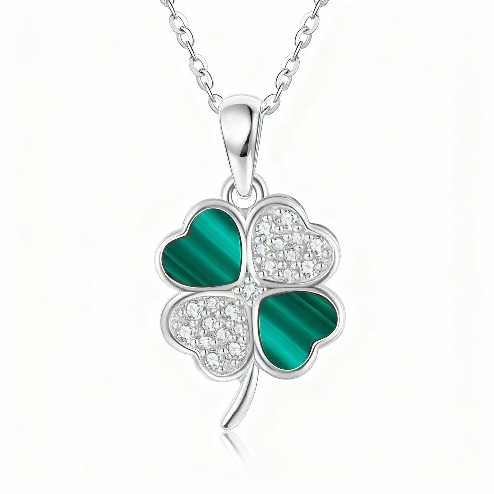 Discover our elegant 10K White Gold pendant necklace featuring a beautifully crafted four-leaf clover adorned with dazzling cubic zirconia and rich malachite.