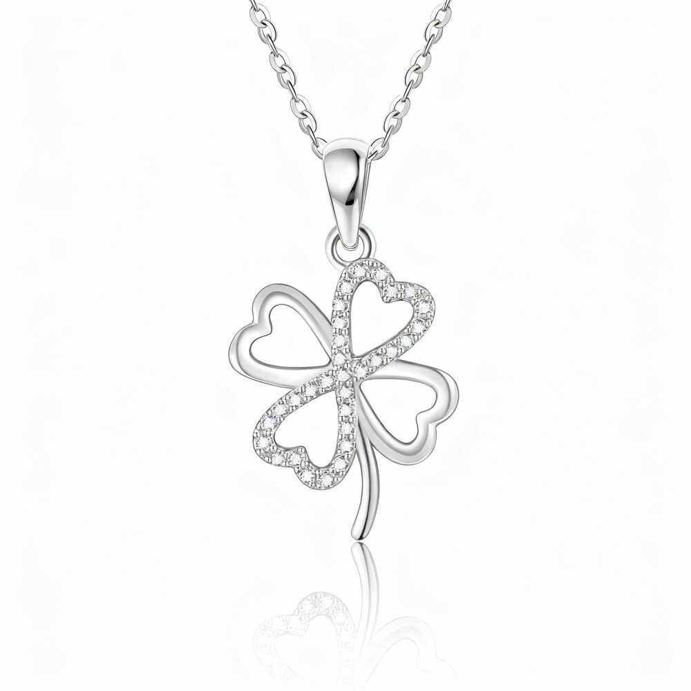 This stunning pendant necklace is crafted from high-quality 14K White Gold and features a beautifully detailed Four Leaf Clover design, symbolizing good fortune and prosperity. The centerpiece is adorned with brilliant Cubic Zirconia stones that sparkle like real diamonds, making it an eye-catching accessory for any occasion. Ideal for women who seek elegance, this necklace is more than just jewelry; it’s a statement piece that enhances your natural beauty. Whether you're dressing up for a special event or adding a touch of glamour to your everyday look, this pendant necklace is the perfect choice. It also serves as a thoughtful gift for loved ones, celebrating moments of joy and luck in their lives. Elevate your jewelry collection with this exquisite piece that combines timeless style with modern sophistication.