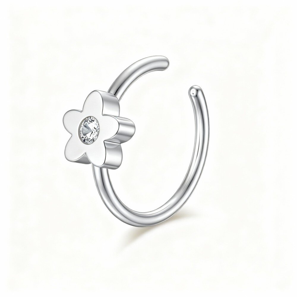 Our Peach Blossom nose ring in 10K White Gold embodies elegance with its delicate design and sparkling Cubic Zirconia, perfect for modern women who love unique jewelry.