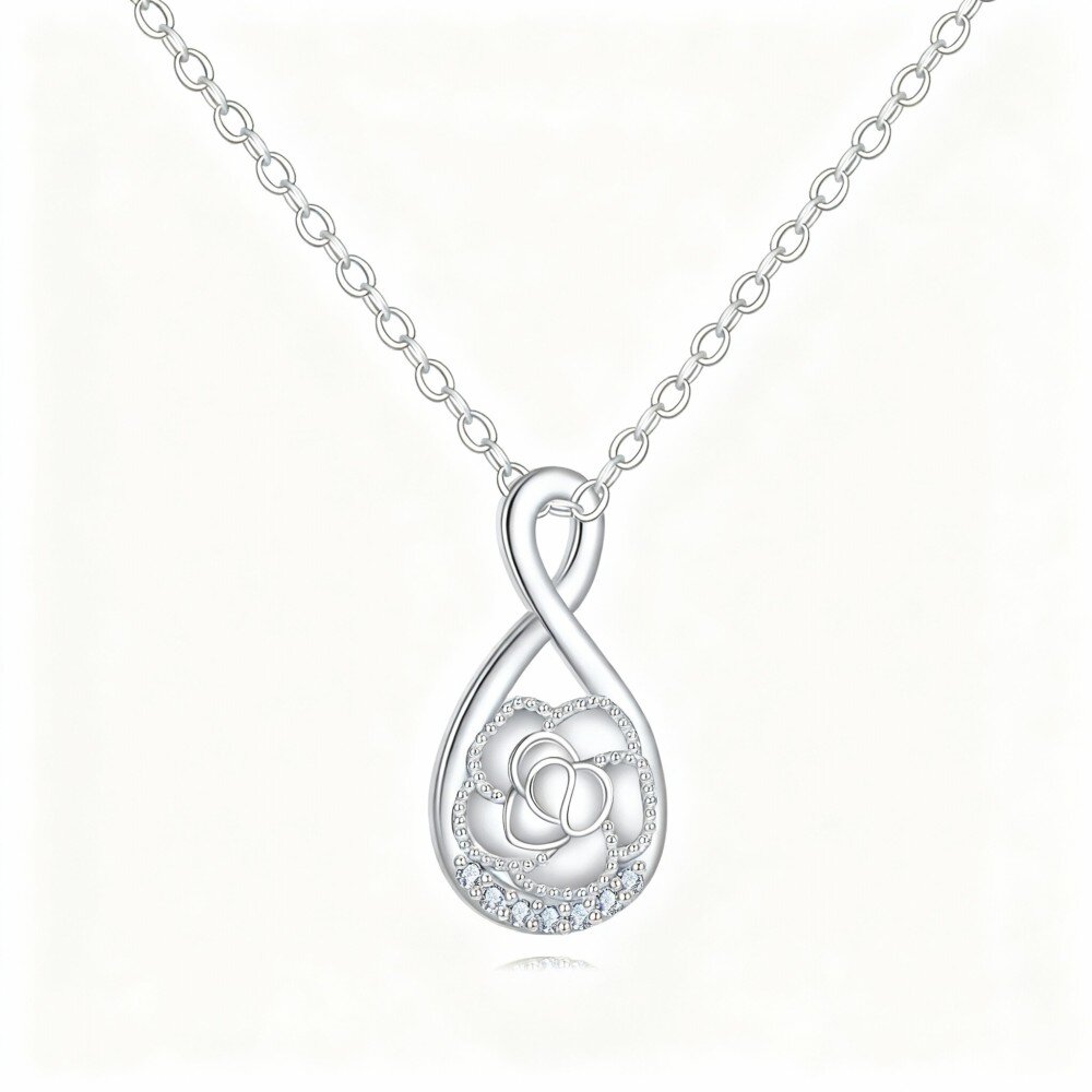 Enhance your elegance with our exquisite 10K White Gold Infinity Necklace, beautifully embellished with dazzling Moissanite stones for a luxurious touch.