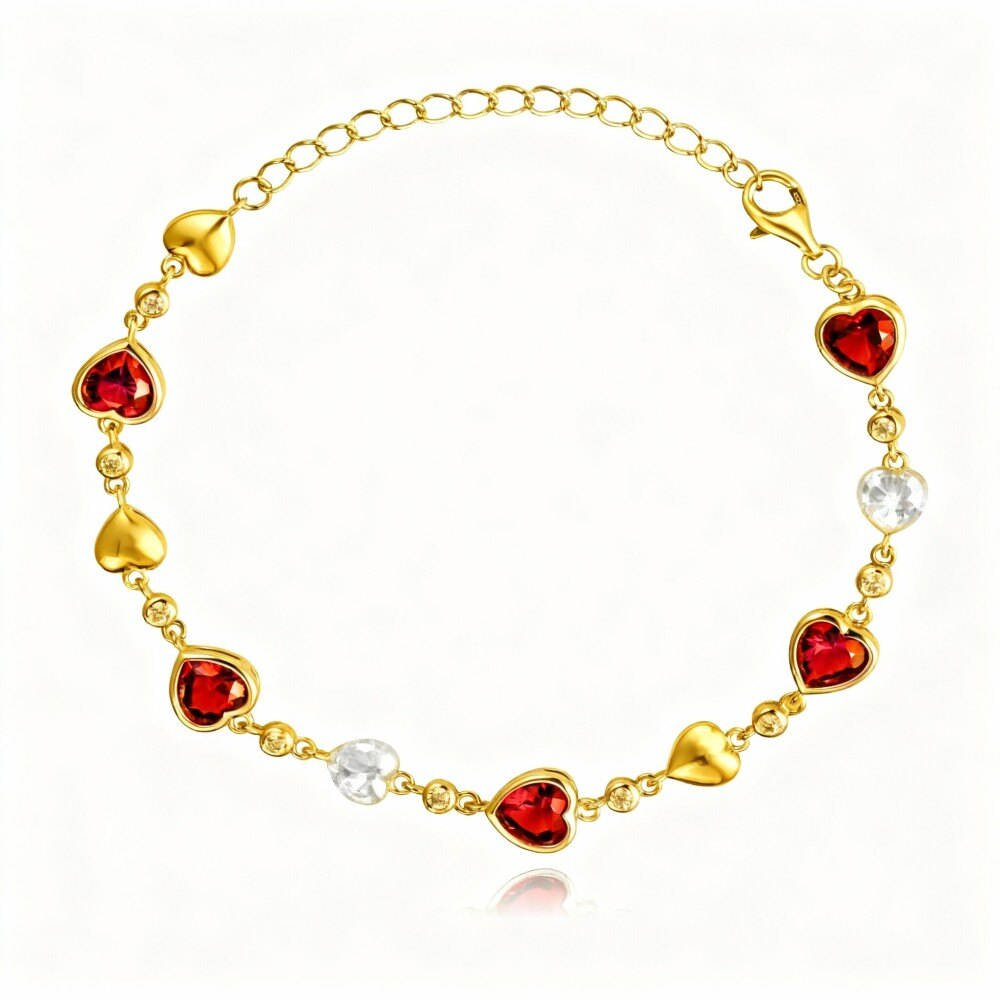 Crafted from high-quality 14K Gold, our charm bracelet features a luxurious combination of ruby accents and heart-shaped charms that symbolize love and affection. The Gold finish adds a contemporary touch, ensuring this jewelry piece is both timeless and fashionable. Ideal for gifting or treating yourself, this bracelet is designed for versatility, allowing you to mix and match charms to express your unique style. Wear it alone for a sophisticated look or stack it with other bracelets for a trendy statement.