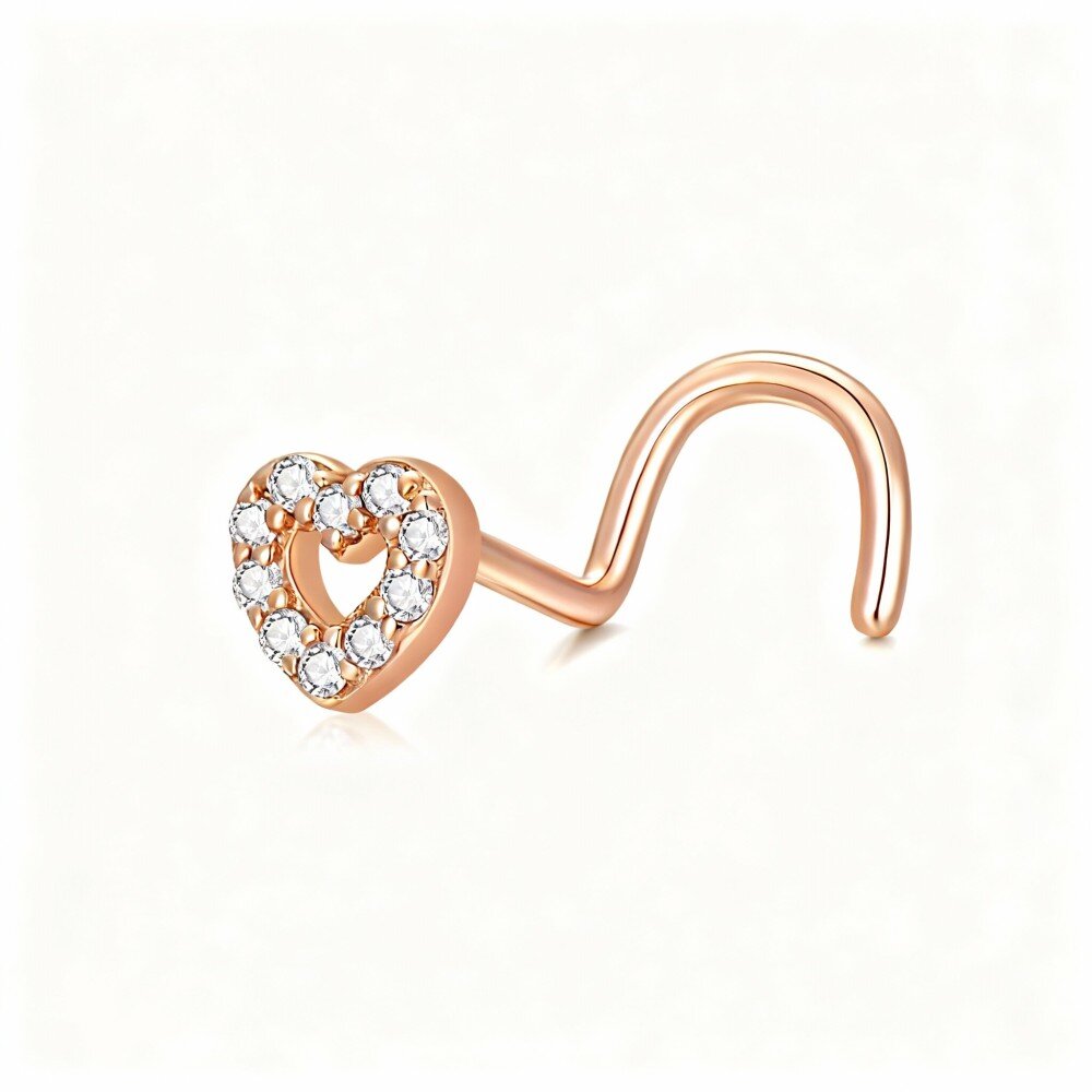 Crafted from genuine 14K Rose Gold, our heart-shaped nose ring is a testament to timeless elegance, offering both durability and a radiant finish. The cubic zirconia centerpiece adds an exquisite sparkle, ensuring you stand out effortlessly. Ideal for those who want to express their style uniquely, this nose ring combines contemporary design with classic allure, making it an ideal accessory for any occasion.