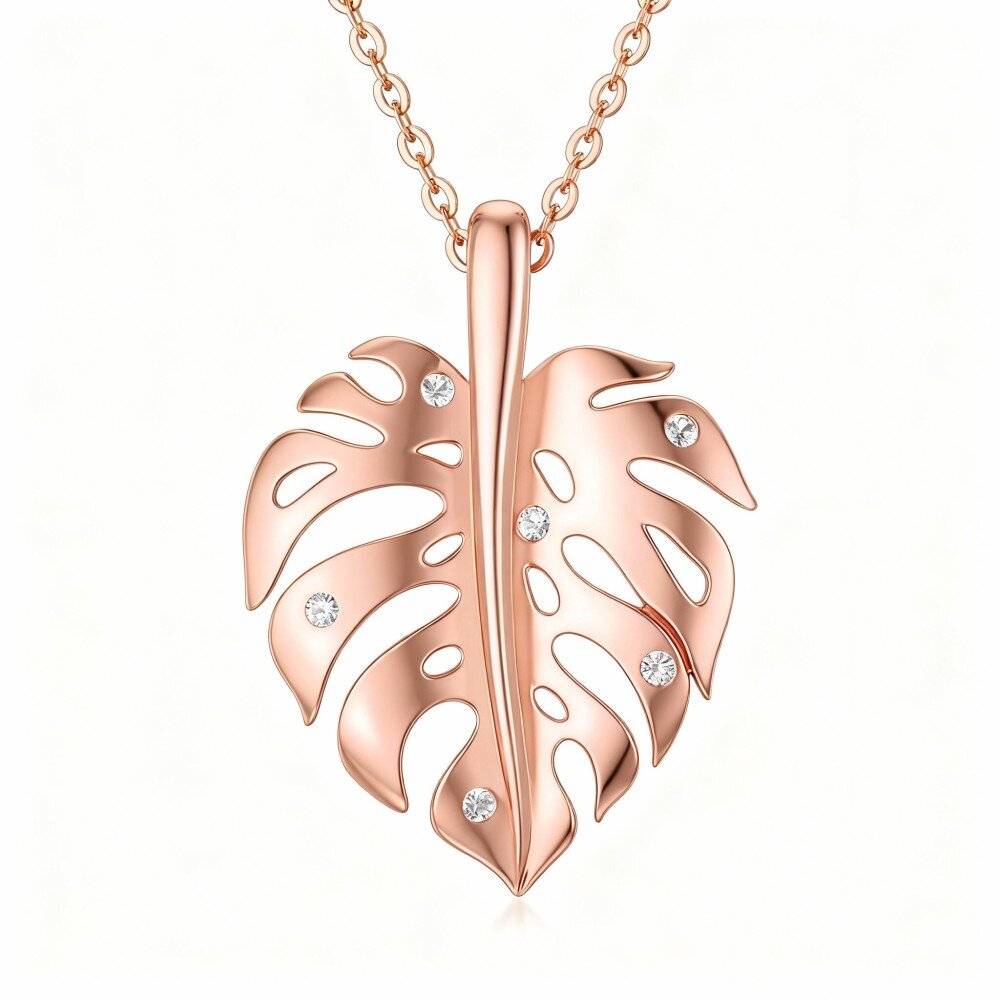Crafted from high-quality 14K Rose Gold, this pendant necklace boasts an intricately detailed leaves design, symbolizing beauty and growth. Each leaf is meticulously set with sparkling Cubic Zirconia stones, ensuring a brilliant shine that catches the eye. This timeless piece is an exceptional addition to any jewelry collection, ideal for special occasions or everyday wear, offering both elegance and durability.