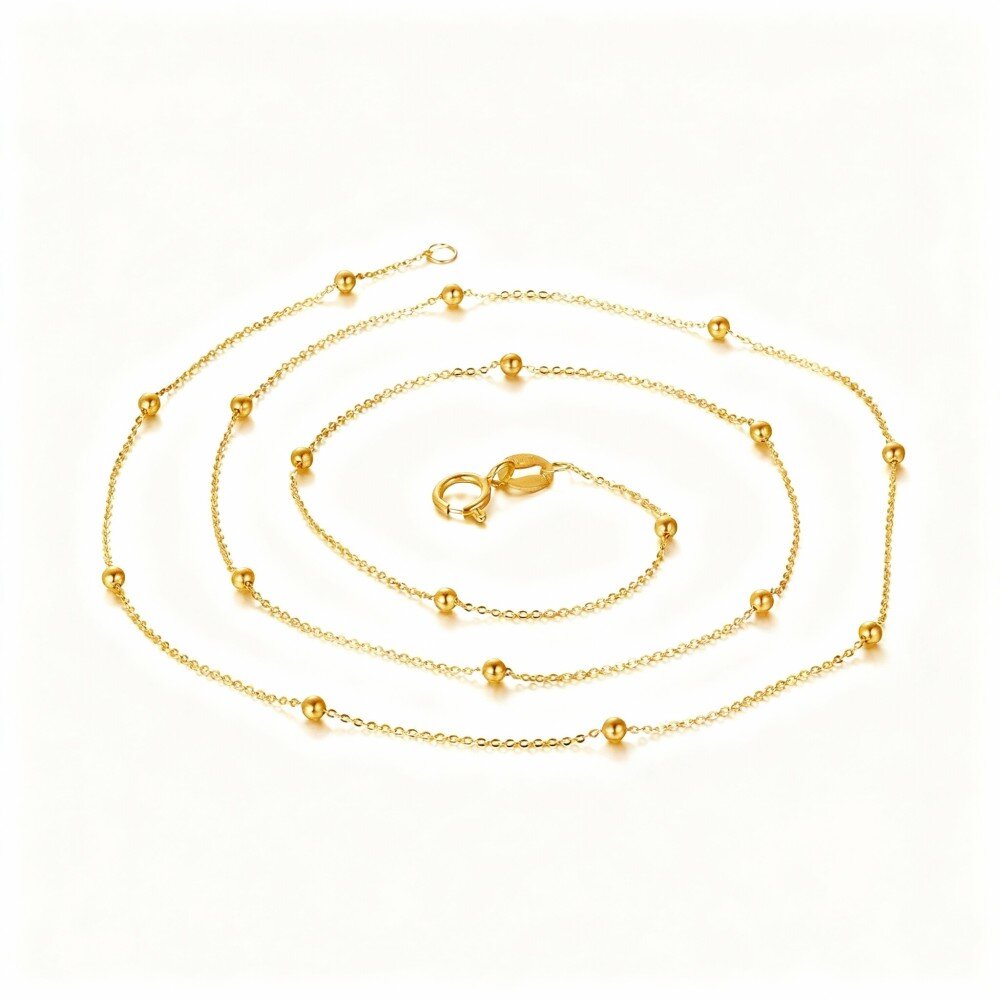 Meticulously crafted from high-quality 18K Gold, this bead station necklace embodies a minimalist yet chic aesthetic, making it the perfect staple for any outfit. Its no-stone design ensures versatile wear, while the warm hues of Gold add a subtle yet distinctive touch. Ideal for layering or wearing solo, this necklace promises enhanced durability and lasting brilliance, making it a must-have addition to your jewelry box.