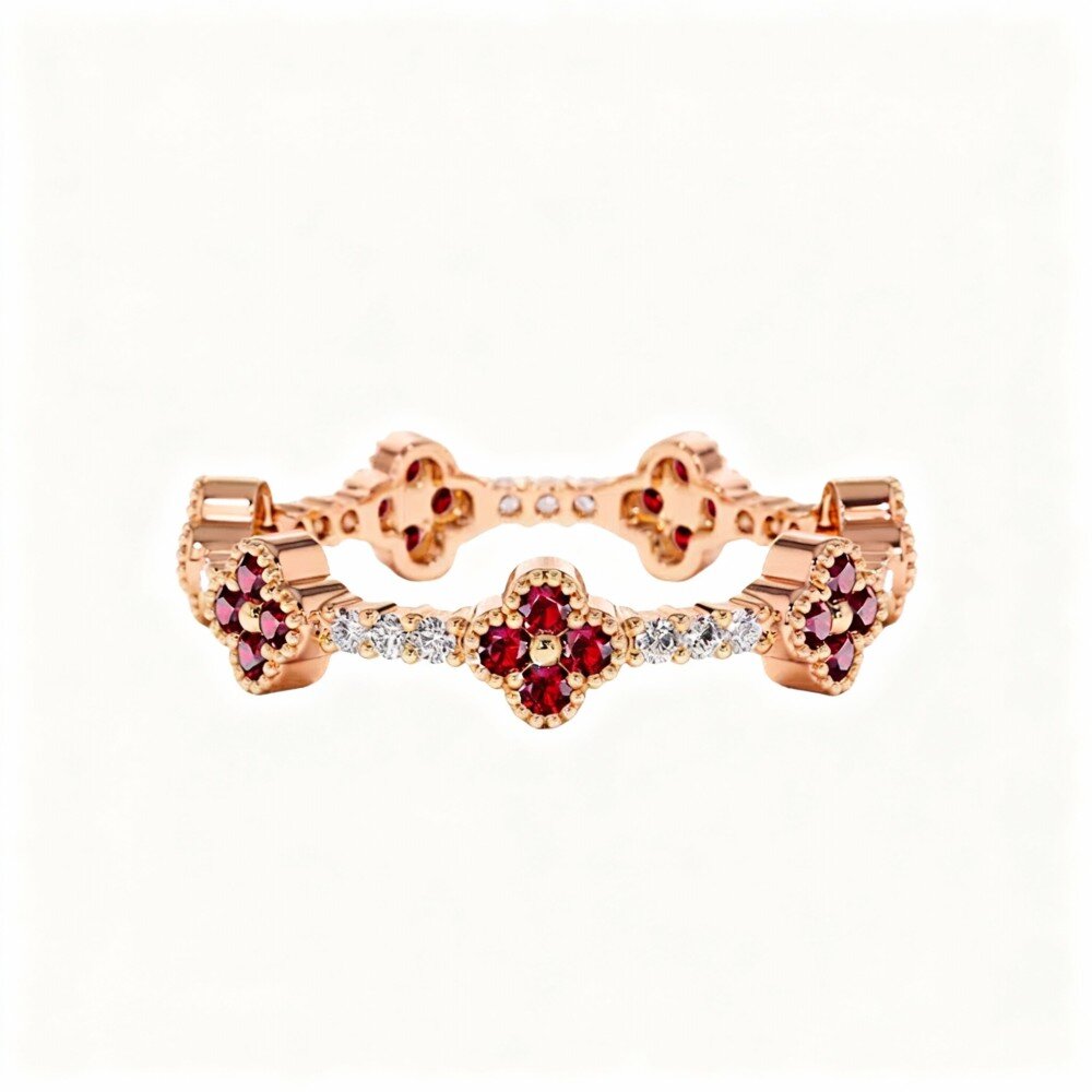 Our exquisite 18K Rose Gold Wedding Ring is a stunning statement piece designed for the modern woman, featuring a breathtaking 0.46 CT Ruby center stone that radiates elegance and sophistication, complemented by shimmering lab-created diamonds that add sparkle and allure. This ring, with exceptional polish, cut, and symmetry, is the perfect symbol of everlasting love and commitment, making it an ideal choice for your special occasion.