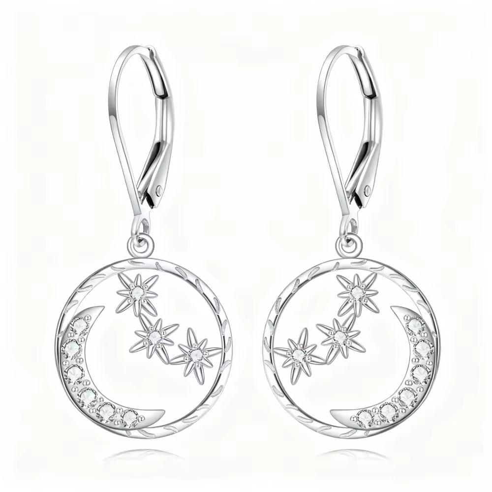 Discover the elegance of our stunning Platinum drop earrings, featuring beautiful cubic zirconia accents in the shapes of a moon and star.