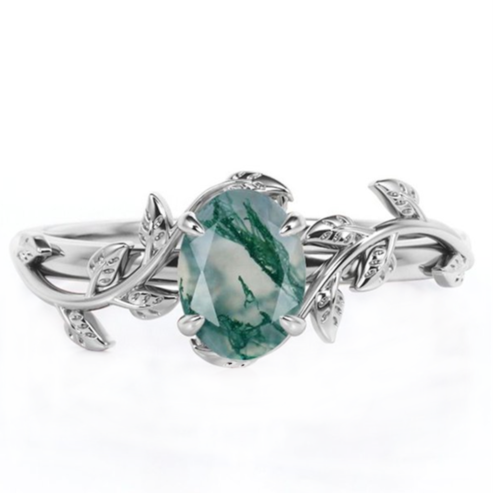 This exquisite piece of jewelry combines the timeless beauty of sterling silver with the natural allure of oval-shaped moss agate, featuring delicate ivy motifs that symbolize eternal love. The white gold plating adds a touch of sophistication, making it the perfect engagement ring for women who cherish unique and meaningful designs.