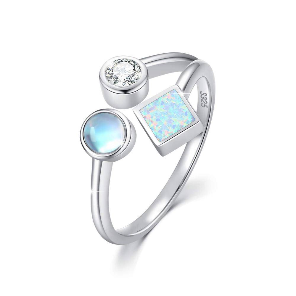 Crafted from premium sterling silver and plated with lustrous white gold, this open ring features a unique princess-square shaped moonstone and a contrasting opal, both radiating a mesmerizing blue glow. The modern design and luxurious materials ensure durability and elegance, making it an ideal accessory for any occasion, whether casual or formal.
