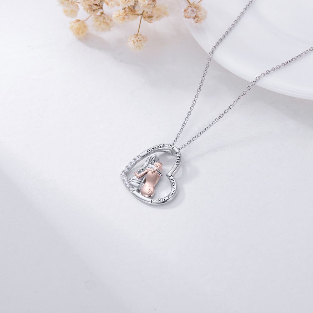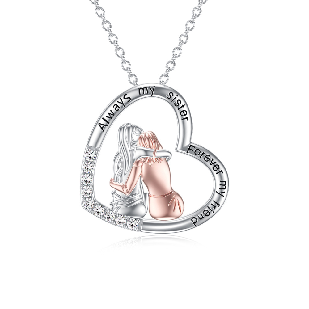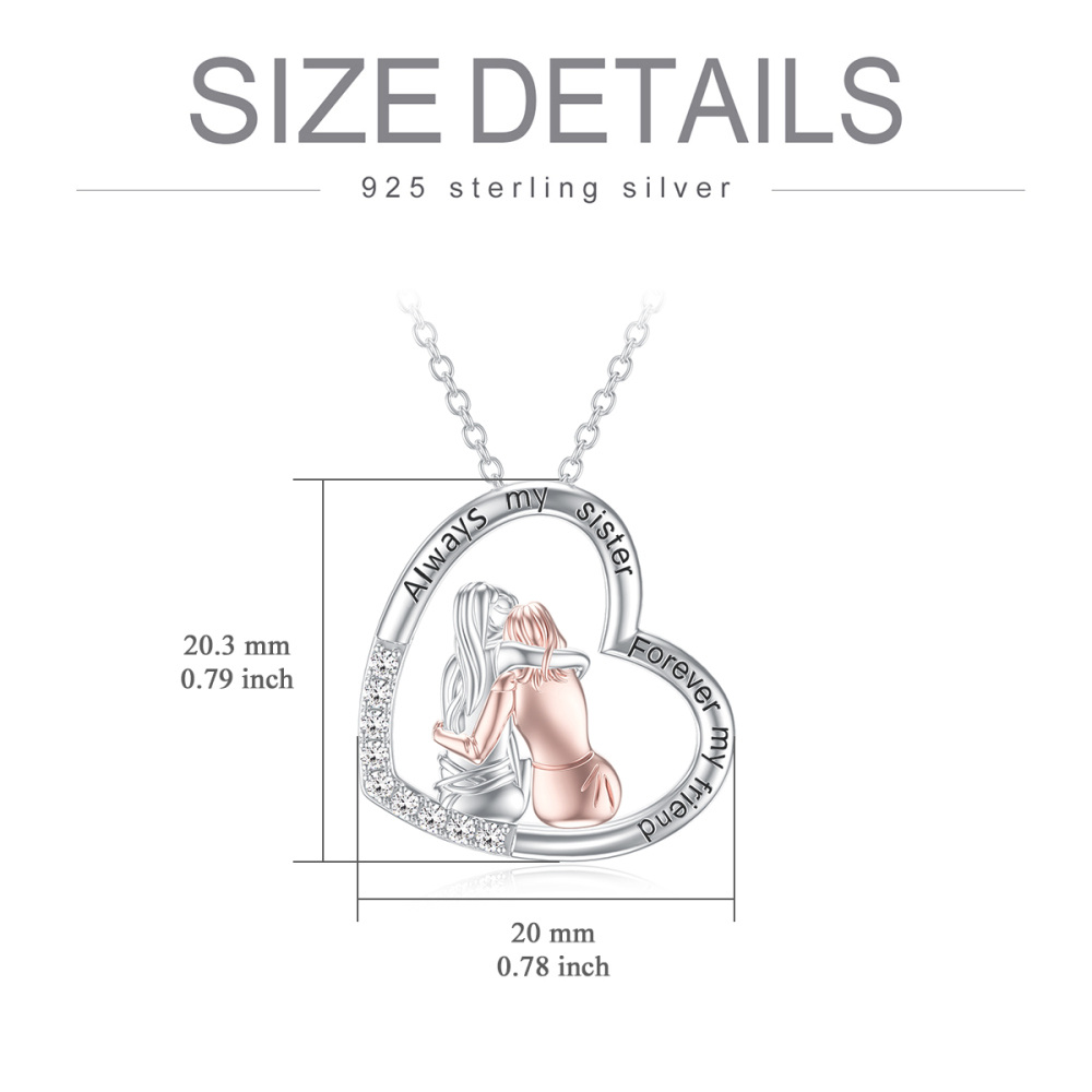 This elegant sterling silver heart-shaped pendant necklace features a shimmering round cubic zirconia centerpiece, beautifully accented with silver and rose gold, making it a heartfelt gift for women. Inscribed with "Always My Sister Forever My Friend," it symbolizes the enduring love and friendship shared between sisters, adding a touch of timeless elegance to any outfit.